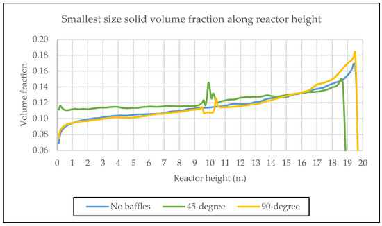 For a clearer observation of this behavior, Figure 8 illustrates the distribution of solid volume fraction for small solid particles along the height of the reactor. At the upper section of the bed, the solid volume fraction of small particles exceeded that in the lower zone. However, upon incorporating 45-degree baffles, the volume fraction of small solid particles in the lower region of the reactor increased. The spikes observed at the 10 m height from the bottom of the reactor were caused by the accumulation of solid particles at the baffles’ walls. Additionally, the distribution of small solid particle volume fractions with 45-degree baffles tended to be more uniform compared to configurations without baffles and 90-degree baffles.