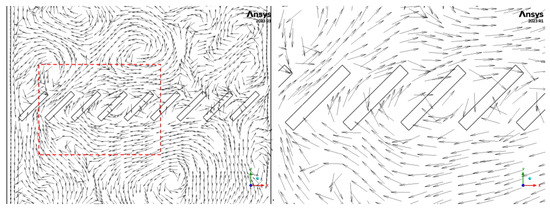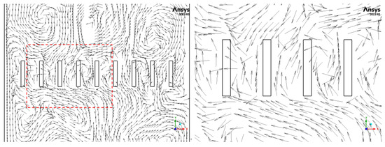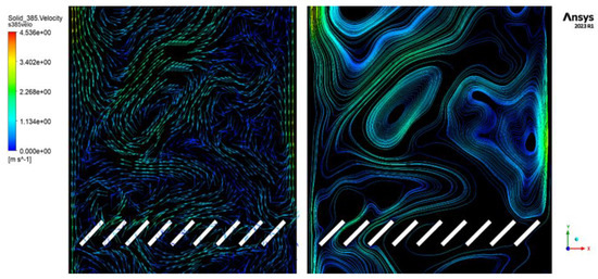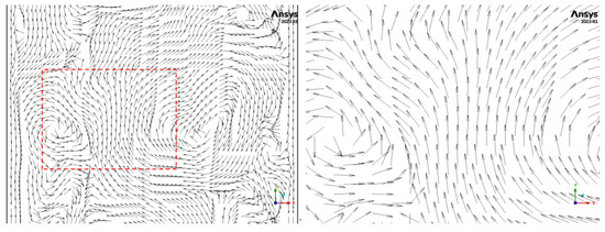 Even though solid particles within the fluidized bed may undergo continuous changes over time, the primary solid behaviors remain discernible, particularly when the system reaches a quasi-steady state. Figure 16 shows the small solid velocity vector after the system reaches the quasi-steady state. It shows that the main behaviors involve solid particles predominantly exhibiting an upward flow on the right side of the reactor and a downward motion on the left side. Additionally, during this phase, there is an observable circulation of solid particles above the baffles.