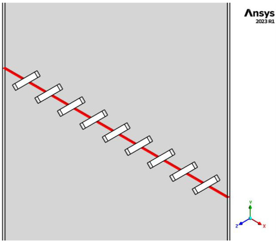 In this study, three parameters were investigated, consisting of baffle angle, baffle stage number, and stage arrangement. Each parameter had two values. There were two different baffle angles in the study, as shown in Figure 2a,b, corresponding to baffle angles of 45° and 90°, respectively. Stage numbers were investigated by comparing single- and double-stage baffles. Finally, the double-stage number was varied with two arrangements: above and below arrangements from the reference position.