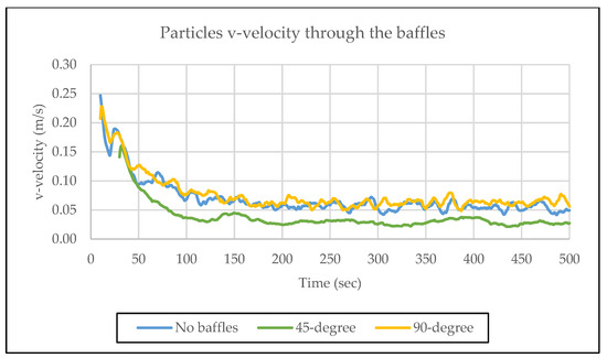 The findings revealed that in a system without baffles and one with 90-degree baffles, solids were able to ascend freely to the uppermost part of the bed. Conversely, in the system equipped with 45-degree baffles, the passage of solids through the baffles was impeded due to the angled configuration of the baffles. This led to a more intricate flow pattern, introducing additional resistance that obstructed the passage of solids through the baffles. The majority of particles were obstructed and compelled to move around horizontally, in parallel with the layout of the baffles. Moreover, some particles collided with the baffles and deflected towards the walls of the baffles, subsequently passing through the gap between the baffles, as shown in Figure 13, and entering the reaction zone above them. Both particle movements resulted in a reduction of velocity in the y direction as they traversed the baffles, as illustrated in Figure 14. The y-direction velocity was determined by calculating the average value, accounting for the respective areas in the calculation (Equation (14)).