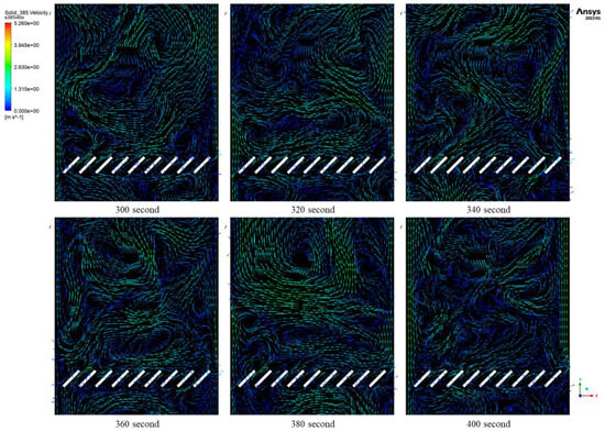 According to Zhang et al. [27], they conducted experiments and observed that when the superficial gas velocity reached approximately 0.4 m/s, there was a distinct internal circulation of solids observed above the louver baffles. As depicted in Figure 9, due to the slant of the baffle blades, bubbles were directed towards one side as they passed through the louver baffle, resulting in an area with higher voidage on that side and an area with lower voidage on the opposite side. The contrast in voidage between these two areas led to solids circulating above the louver baffle, with solids descending in the low-voidage region and rising in the high-voidage region. These two regions are referred to as the “bubble-laden” and “emulsion-downflow” areas, respectively. This particle behavior was observed in this study, as shown in Figure 15.