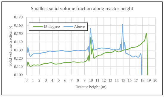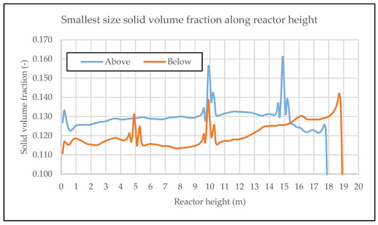Time-averaged smallest particle volume fraction along reactor height comparison.