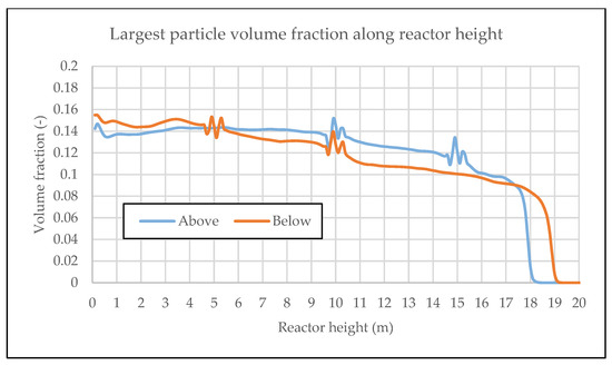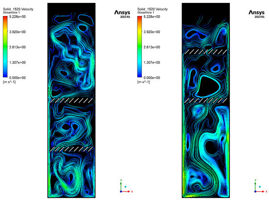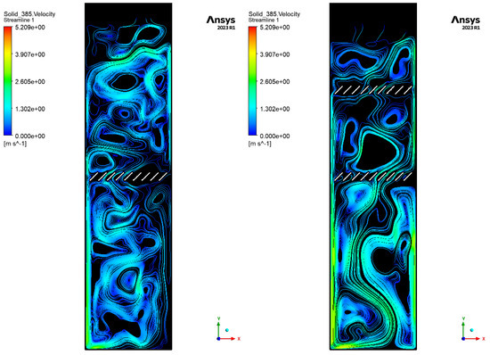 In the ‘below arrangement’ case, the additional stage was located closer to the bottom of the reactor than in the ‘above arrangement’ case. This proximity caused the largest particles to accumulate and swirl in most of the area between the bottom of the reactor and additional stages, impeding their movement through the first stage. This swirling behavior led to a higher-volume fraction of the largest particles under the additional stage. In contrast, in the ‘above arrangement’ case, with a larger area between the bottom of the reactor and the first stage baffles, particles could move upward more easily, resulting in a higher solid velocity through the middle stage that is shown in the streamlined color and average velocity chart in Figure 25 and a more uniform particle volume fraction in this zone. However, the additional stage still caused swirling and hindered particle movement, resulting in a lower particle volume fraction at the top of the bed.
