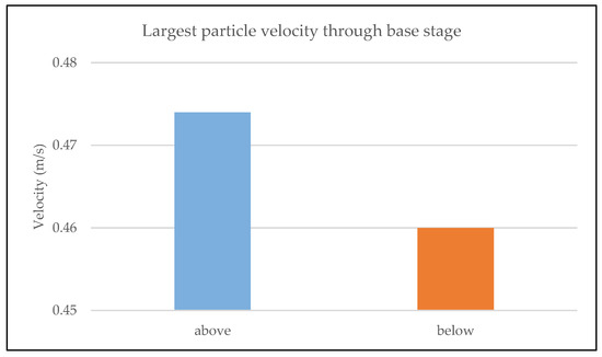 In both cases, the additional stage was located closer to the first stage. This proximity caused the largest particles to accumulate and swirl in most of the area between the two stages, impeding their movement through the additional stage that is shown in Figure 24. This swirling behavior led to a higher volume fraction of the largest particles under the upper stage.
