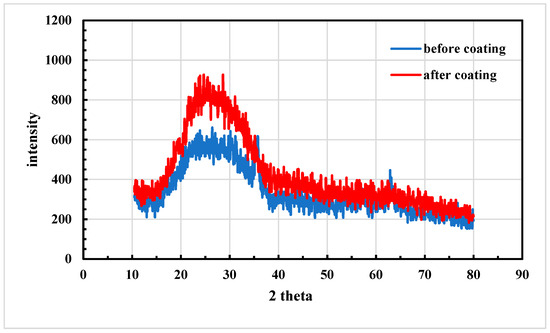 Therefore, the main difference observed in the XRD patterns of the glass beads with and without a coating is the existence of specific peaks, which can be attributed to the presence of iron oxide in the coated samples. The finding above provides irrefutable evidence of the efficacy of the coating process.