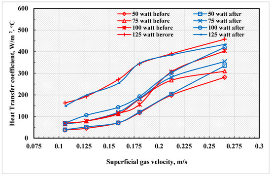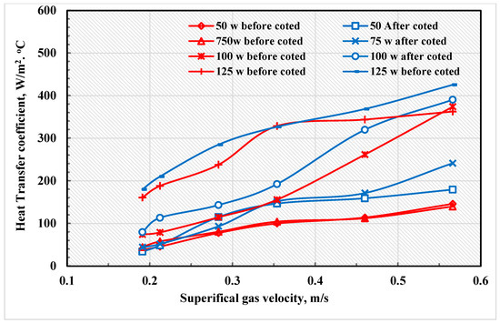 The effectiveness of heating power on the heat transfer coefficient was investigated in an air–glass bead fluidized bed. The study aimed to evaluate the impact of different heat inputs and velocities on the heat transfer coefficient before and after coating, as presented in Figure 4 and Figure 5. The gas velocity and the power of the heater directly affect the heat transfer coefficient in a fluidized bed. An increase in gas velocity enhances the kinetic energy of particles, leading to better mixing and improved heat transfer. Similarly, a higher heater power provides more thermal energy, increasing the temperature gradient and driving heat transfer. However, it is crucial to maintain a balance to prevent hot spots and non-uniform heat distribution. In the industry, controlling these parameters is vital for processes such as petroleum refining, waste treatment, chemical synthesis, and heat treatment of metals, as it allows for better process optimization, leading to improved efficiency and cost-effectiveness. The results show the heat transfer coefficient values before and after coating and operating a fluidized bed with heating using different heating fluxes and velocities. The values indicate an increased heat transfer coefficient after fluidized bed heating, which is more significant at higher velocities, as depicted in Figure 4. For instance, at a velocity of 0.106 m/s and a heating flux of 50 W, the heat transfer coefficient increased from 38.12 to 39.2 W/m2·°C after coating. At the same velocity but with a heating flux of 125 W, the heat transfer coefficient increased from 148.5 to 162.8 W/m2·°C after coating the glass beads, which represented a more significant increase.