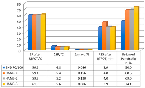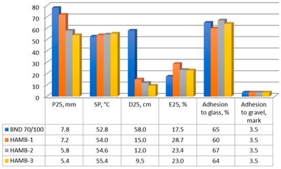 - the optimal modification temperature is 120 °C, which is confirmed by the values of the initial penetration, which is the highest for the HAMB-1 sample and is 7.2 mm compared to HAMB-2 and HAMB-3 samples. Also, for the HAMB-1 sample, the values of ductility and elasticity determined at 25 °C are the best;