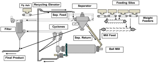 Cement plants typically grind cement in closed milling systems. Figure 1 shows a simplified flowchart of a grinding circuit, including all essential installations. We used the same configuration in [] in a study of optimization of the process control of cement milling. The weight feeders feed the raw materials to either the ball mill or the separator (fly ash). The recycling elevator directs the output from the mill to the dynamic separator. The fine stream from the classifier constitutes the final product, whereas the coarse material returns to the CM for further grinding. The critical parameters related to quality include (i) cement fineness, (ii) separator speed, (iii) ratio of the coarse material-flow rate to the mill-feed rate, (iv) recycling elevator power, and (v) air-flow rate through the mill and pipes.