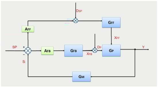 The presence of two distinct types of disturbances in the process variable provides the benefit of employing two controllers, acting separately on the control variable. Our earlier study introduced a dual regulator [], comprising feedforward and feedback modules (FF–FB). Figure 2 depicts the block diagram of the transfer functions and signals related to the sulfate control.
