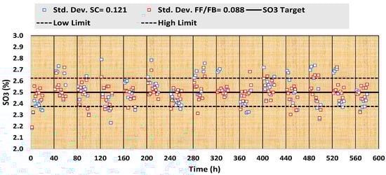 The s-charts shown in Figure 4b, Figure 5b, Figure 6b, Figure 7b and Figure 8b illustrate a pronounced decrease in the annual standard deviation after the FF–FB controller started operating. The of FF–FB is always lower than the LCL of SC, indicating that the former controller attenuates disturbances caused by sulfate variability in the raw materials better than the latter. Table 6 shows the pooled standard deviations for the five CEM types produced and their ratios when a CEM covers both periods (SC and FF–FB).