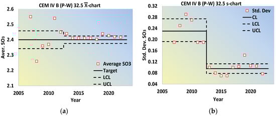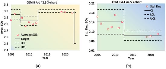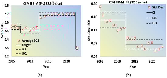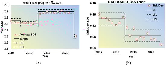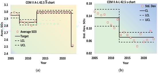The Shewhart control charts [] (pp. 8–9) are suitable for comparing the results of the two control techniques in the long term. These charts require data in rational subgroups taken at approximately regular intervals during the process. In this study, each subgroup contains all the SO3 results of samples taken during one year per CM and CEM type. We performed the comparison by generating mean () and standard deviation (s) charts. We separated the results into two groups: (a) the period of SO3 adjustment using Equation (16) (2005–2012) and (b) the period of FF–FB controller application (2013–2023). The central line (CL) of the -chart is a prespecified process parameter equal to the SO3 target per CEM type. Because the number of samples ni varies annually, we used the pooled standard deviation sPk [] (p. 93) to determine the central line of the s-chart and the control limits, as shown in Equation (18).