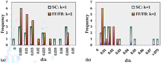 The mean charts depict the closeness of the annual mean SO3 to the target. In all CEM types and both CMs, applying the FF–FB controller leads these two variables into proximity. In the case of the SC regulator, the average sulfates and their target are close for the Portland types but not for the pozzolanic cement. The comparison of the differences between the target, STik, and the realized SO3, Savik, requires a statistical test. Equation (22) computes the absolute value dik of this difference, and Figure 9a,b shows this function for two CEM types.
