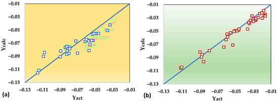 The correlation coefficient between clinker and gypsum, r(CL, G), using the FF–FB is significantly higher than that using the SC controller. The above perfectly explains the considerable improvement in the annual standard deviation in Portland cement, shown in Table 8. Applying the SC controller, the r(FA, G) is around null, becoming significant using the FF–FB. The conclusion is that FA and G are uncorrelated, and the SC cannot compensate for SO3 disturbances in fly ash, which the FF–FB controller satisfactorily achieves, resulting in a noticeable drop in the pooled standard deviation for the pozzolanic cement. Figure 10a,b compares actual and calculated values, yact and ycalc, whereas Equations (31) and (32) provide these two variables. This figure clearly explains the significant increase in R2 in the FF–FB case compared with the R2 of SC.