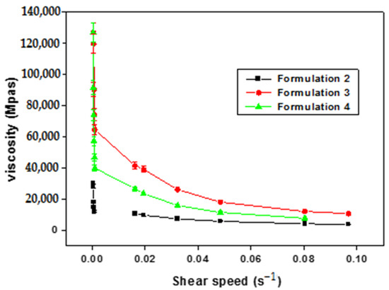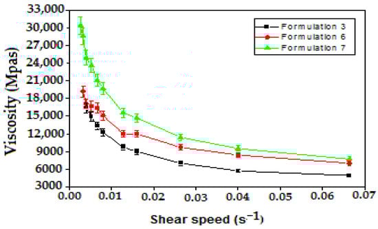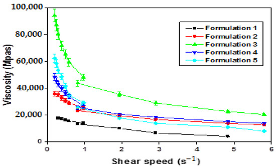 The viscosity evolution in relation to the shear rate for all formulations is visually depicted in Figure 9.
