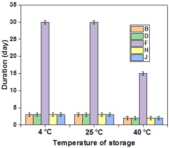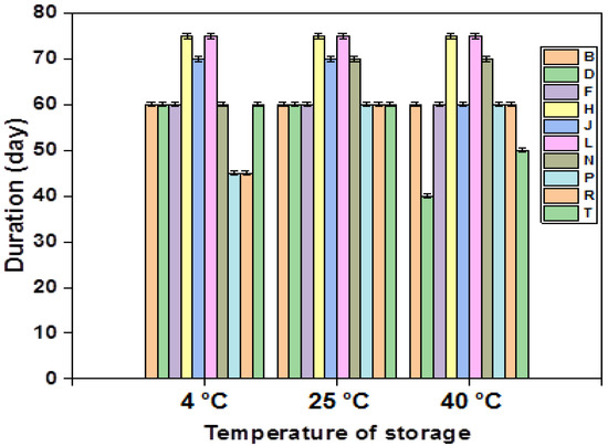 All multiple emulsions formulations (F1–F10) were subjected to stability tests at different temperatures (4 °C, 25 °C, and 40 °C); the results are presented in the figure (Figure 3).