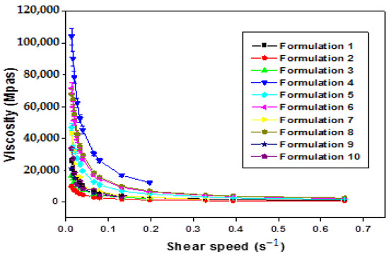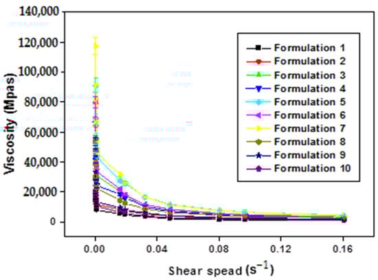 The increase in the shear rate of all formulations (F1–F10) leads to a gradual decrease in viscosity (Figure 4). This confirms that all the formulations obtained are of non-Newtonian pseudo-plastic fluid type with a shear-thinning character.