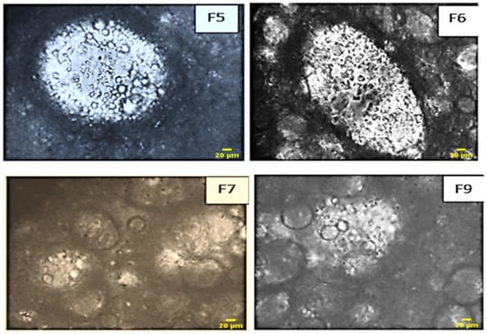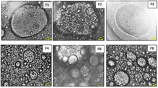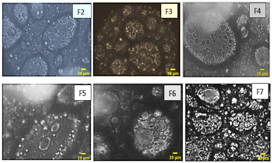 The obtained optical microscopy images for different formulations (F2, F3, and F4) were produced using optical microscopy with an enlargement (×1000) endowed with a photomicrograph (Figure 2).