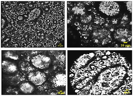 The observation of different optical microscopy images shows the presence of a multiple emulsion in most of the formulations obtained (Figure 8).