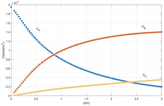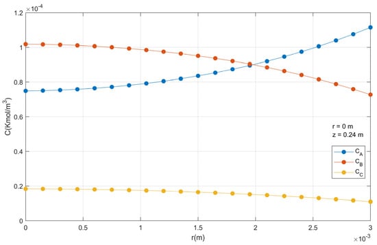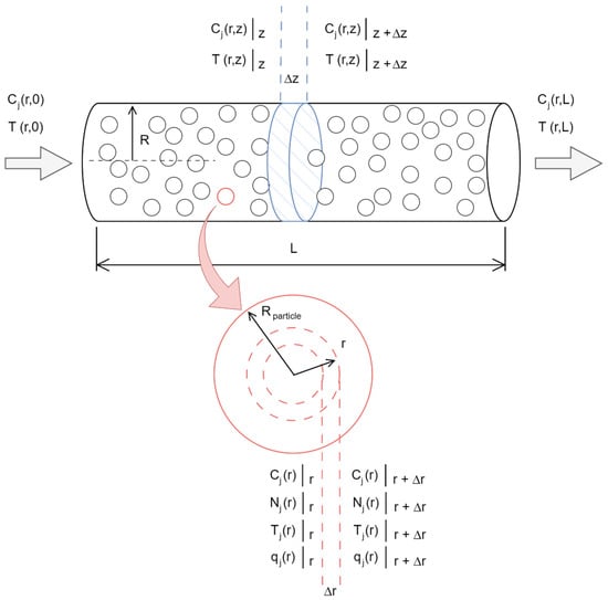 In this work, the modeling is based on the scheme presented in Figure 2, where material and energy balances are considered in the reactor bed with radial diffusion. From this, radial and axial profiles of the concentration of each component, denoted as Cj(r, z), and temperature, denoted as T(r, z), are obtained. Subsequently, material balances for each component are performed within the spherical particle of radius r, denoted as Cj(r), and temperature T(r). This must be coupled with Fick’s and Fourier’s laws, resulting in concentration profiles for each component, molar flux density of each component, temperature profile, heat flux density profile, and the effectiveness factor of each particle along the bed using the implicit finite difference method.