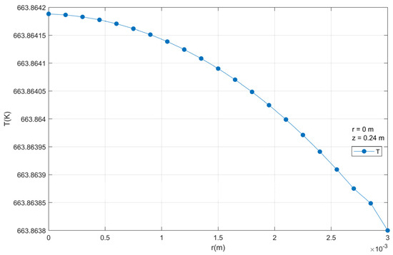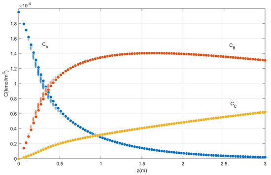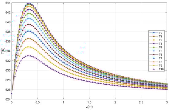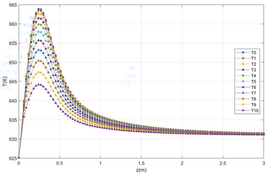 The temperature profiles produced in the catalytic bed as a function of the reactor length are presented in Figure 4. Note that the reaction temperature increases rapidly near the reactor inlet reaching the maximum temperature. This behavior is the same as that reported in literature [27] for the same conditions of T0 = Tw = 625.15 K.