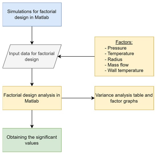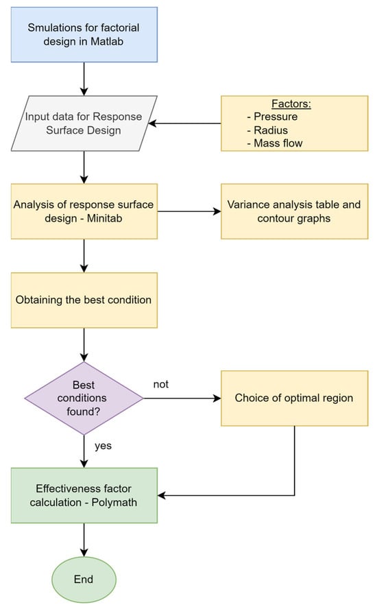 The Matlab® software (R2015a) was used for the data generation through the resolution of the differential equations system, and Minitab was used for optimization. The results of interest were the concentration profiles. In this sense, for an adequate management of the information, the indicator “average value of phthalic anhydride concentration at the reactor outlet” has been defined as a response variable. The flowchart shown in Figure 5 summarizes the process.