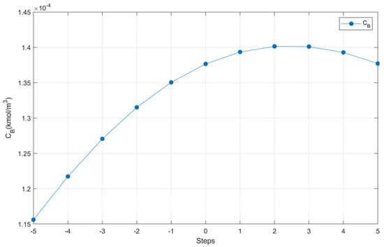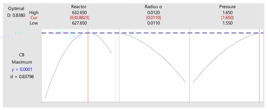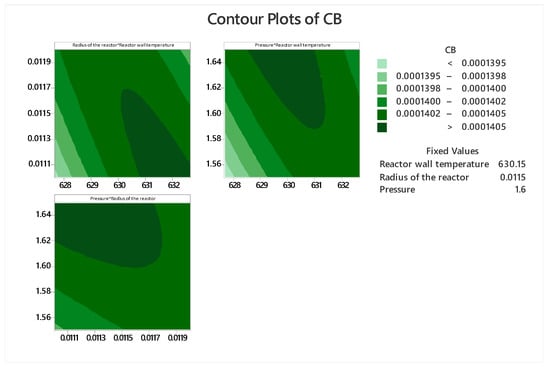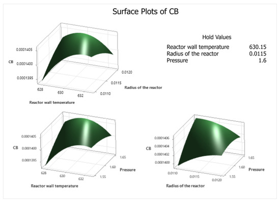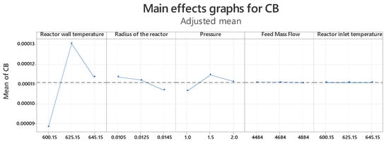 Thus, Figure 6 shows the graph of main effects for the concentration of phthalic anhydride in the reactor outlet. The three points in each graph represent low, medium, and high values for each factor; the medium values were taken from Table 1 (inlet temperature, external reactor wall temperature, operating pressure, reactor radius, and mass flow rate of ortho-xylene), which likely have the greatest influence on the dependent variable (CB); while the high and low values were assigned with reference to the central point. And it is observed that for the condition Tw = 625.15, radius = 0.0105 and pressure = 1.5, values that maximize the response are obtained.