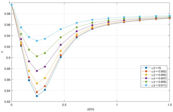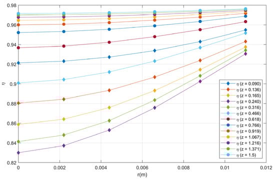 Equation (17) is used for all points on the radial position except the center. When r = 0, Equation (17) is indeterminate, therefore, the L’Hôpital’s rule is applied, resulting in: