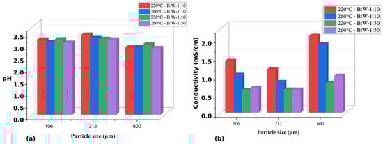 To monitor the evolution of the pertinent compounds generated in the liquid phase, measurements of pH and conductivity were made. Consequently, a plot of the conductivity and pH results is displayed in Figure 1. First, the difference in conductivity was found to be approximately one unit throughout the whole data set, and the variation in pH was found to be less than one unit based on the data displayed by the pH graph. Based on the findings, it was clear that sugarcane bagasse tends to produce more ions at 600 μm than at 106 and 212 μm when compared to treated biomass. Similar trends could also be seen in the conductivity graph, where an increase in conductivity values was seen for reaction operating parameters carried out with a 600 μm size. Possibly this is since small particle sizes can favor different reaction mechanisms with the medium, such as polymerization due to the increase in the surface area of the particle, which leads to a lower formation of acidic species in the aqueous medium [19,40].