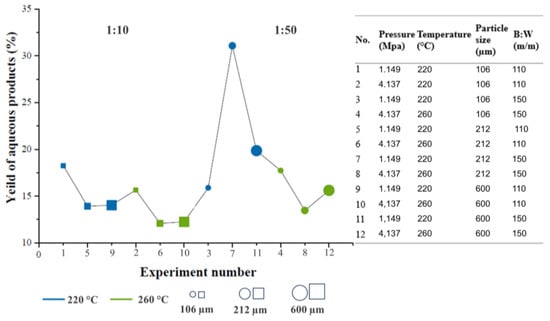 Figure 3 shows the yields of the aqueous fractions. It is observed that in experiment 7, the best yield in weight of the aqueous products was obtained (31.073%). The conditions of said experiment were a B:W ratio of 1:50, a temperature of 220 °C, and a particle size of 212 μm (as presented in the Materials and Methods section). When comparing the effect of particle size with the results obtained, it was observed that the experiments performed with a B:W ratio of 1: 10 produce better yields when the particle size of 106 μm was used (18.25 and 15.65% at 220 °C and at 260 °C, respectively). This is because smaller particle sizes undergo higher conversions because reducing the size of the biomass favors a greater diffusion of water in the biomass, which results in a faster decomposition of the lignocellulosic material, resulting in a decrease in yields [13,34].