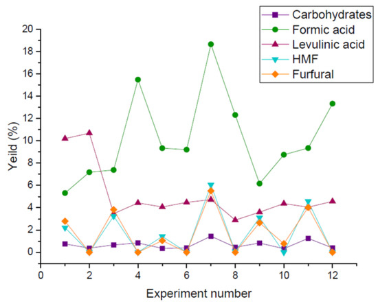 Also, Figure 4 shows the percentage yield for each of the platform chemicals that constitute the total yield of the aqueous phase products. From the information provided by this graph, it was observed that formic acid is the chemical product with the highest formation from sugarcane bagasse under HTC conditions, followed by levulinic acid. According to what has been reported by other studies, cellulose and hemicellulose in a hydrothermal system are known to hydrolyze at temperatures above 180 °C [42]. However, when the reaction system reaches 220 °C, further decomposition of cellulose and hemicellulose occurs. This occurs through a hydrolysis reaction where the ester and ether bonds (mainly the O-glycosidic bond) are broken to produce soluble oligomers such as saccharides and monosaccharides. Sugarcane bagasse is known to contain mainly glucose, galactose, xylose, and arabinose [43,44,45].