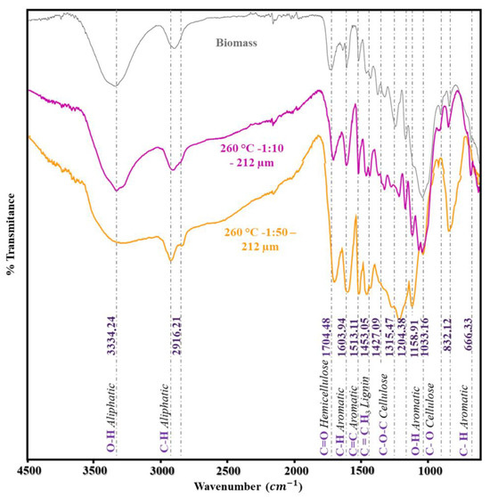 Infrared spectroscopy was done to see structural alterations in the lignocellulosic material’s chemical composition. IR spectra of the untreated biomass and those found in the solid products of the hydrothermal treatment were compared in Figure 5. The unaltered biomass is represented by the gray spectrum. Owing to the material’s heterogeneity, numerous distinguishing peaks of the bonds pertaining to the biopolymers that make up the lignocellulosic biomass were visible. Thus, the cellulose, hemicellulose, and lignin bond characteristic peaks were found in the fingerprint region and are as follows (cm−1): 666.33–833.12–1033.16–1158.91–1204.38–1315.47–1427.09–1453.05–1513.11–1603.94–1704.48.