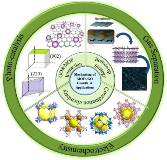 Furthermore, the selection of organic ligands in organometallic frameworks can be tailored to complement the functional groups on GO, enhancing compatibility and fostering targeted interactions. The resulting hybrid material exhibits improved light absorption and efficient charge separation, rendering it well suited for solar energy harvesting applications, including photovoltaics and solar fuel generation [30,31]. Moreover, organometallic–GO hybrids demonstrate promising performance in energy storage devices (e.g., batteries and supercapacitors) and conversion systems (e.g., fuel cells), thereby contributing to sustainable eco-energy solutions [32].