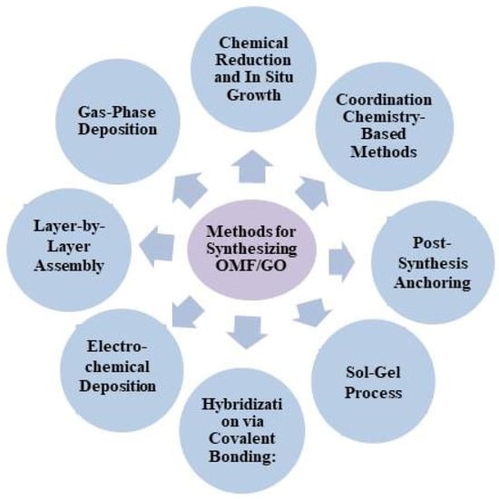 The sol–gel process converts metal-containing precursors into a sol or gel, which is then combined with GO and subjected to controlled gelation or drying processes to form the composite material, offering excellent control over composite composition and structure [47]. Covalent bonding strategies form strong chemical bonds between functional groups on GO and organometallic moieties, ensuring a stable and durable hybrid structure under various environmental conditions [48]. Electrochemical deposition allows for controlled growth of organometallic frameworks on graphene oxide surfaces by applying an electric potential, enabling precise control over layer thickness and morphology, which influences composite properties [23,49,50]. Layer-by-layer assembly involves stepwise deposition of alternating layers of graphene oxide and organometallic components, creating a well-defined multi-layered composite structure, allowing for tailoring of layer thickness and composition for fine control over composite properties [23,51,52,53].