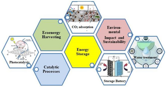 Figure 3 illustrates the multifaceted applications of organometallic–graphene oxide composite materials, emphasizing their importance in energy harvesting, energy storage, catalytic processes, and environmental applications. Detailed explanations are provided in the subsequent sections.