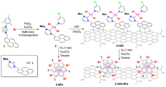Synthesis of palladium complex 2, immobilization onto rGO (2-rGO), and synthesis of free palladium NPs (2-NPs) and supported onto rGO (2-rGO-NPs). Reprinted from Ref. [154].
