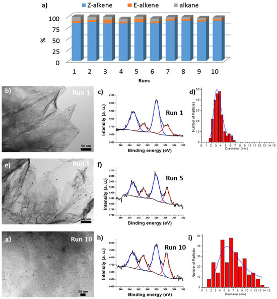 (a) Recycling of 2-rGO (0.5 mol %) in the hydrogenation of 1-phenyl-1-butyne with molecular H2. First run at 1.5 h because of the induction time and next runs at 1 h. HRTEM image after run 1 (b), run 5 (e), and run 10 (g) and the corresponding XPS spectra of runs 1 (c), 5 (f), and 10 (h). Blue line corresponds to the Pd(II) core-level peaks 3d and red line corresponds to the core-level peaks 3d of Pd(0). Particle size distribution histograms for run 1 (d) and run 10 (i). Reprinted from Ref. [154].