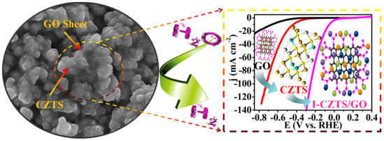 Illustrated in Figure 7, the fabrication pathway of the ICZTS/GO electrocatalytic system delineates the integration of metal precursors alongside the pivotal role of GO as a supporting material. GO not only serves as a scaffold but also enhances the HER activity, a detailed synthesis of which is expounded upon in Reference [165]. Notably, the comparative assessment of CZTS and GO electrodes reveals their subpar HER activities in contrast to I-CZTS/GO composites. The augmented electrochemical performance observed in CZTS/GO composites is attributed to the synergistic electronic and chemical interactions facilitated by the CZTS-GO interface (refer to the schematic depiction in Figure 8).