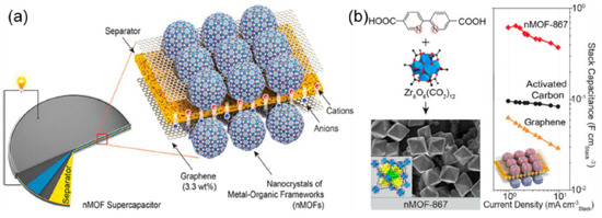 (a) Schematic depiction of nMOF/graphene supercapacitors, and (b) nMOF 867 along with the stack capacitance of nMOF-867/graphene, activated carbon, and pristine nMOF-867. Reprinted from Ref. [189].