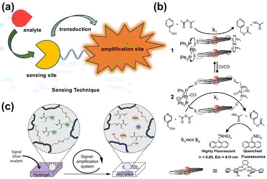 When closely observing supramolecular interactions and assembly, a resemblance with biomolecular interactions is apparent. Scientists from various fields have manipulated or utilized supramolecular chemistry to produce biologically relevant outcomes. G-Quadruplex [] is one such celebrated example, wherein a natural folding process of nucleic acid has been used by several groups in both biological and non-biological research fields [,]. Sensing platforms have a common configuration, as shown in Figure 1a. This includes a component that interacts with the analyte, that is, a sensing site. When the analyte binds to the sensing site, the signal is transduced to the amplification site, which produces a visible outcome or macroscopic effect that is detectable by devices []. For supramolecular systems, such interaction can happen in a single molecule or can generate a cascade of processes within the vicinity of the molecular constitution to show some detectable outcome. Supramolecular fluorescent sensors are a perfect example of such systems []. Gianneschi et al. designed an allosteric supramolecular catalyst that transduces the signal to a pH-responsive fluorescent probe (Figure 1b). Such an Rh-based complex compound achieves cavity opening by the interaction of nM-scale concentration of Cl− ions, catalyzing a special type of chemical reaction that lowers the pH of the system and triggers the fluorescence of anthracene fluorophore to generate a detectable signal []. Elkema and co-workers devised a disulfide hydrogel scaffold with allylic phosphonium salt which, upon reaction with thiol analyte, triggers gel breaking and visible detection of thiols (Figure 1c). They developed a numerical model to predict the amplification cycle’s response to different concentrations of thiol triggers and validated it with experimental data. The system is capable of detecting various thiol analyses, e.g., small molecular probes, DNA, glutathione, protein, etc., at a detection range of 132 to 0.132 μM. The researchers found that the amplification cycle could be initiated by force-generated molecular scission, allowing for damage-triggered destruction of hydrogels []. The supramolecular systems described in the last two examples rely on the supramolecular forces described earlier in this section. A fine balance of energy between different supramolecular interactions triggers a transformation from one configuration to the other. In the former example of a cavity-based allosteric fluorescent sensor, Cl− ions open the cavity by coordinating Rh centers of the complex, then catalyze an acid-generating chemical reaction. Such cavity opening exposes reaction sites, and a shift in the chemical equilibrium of an acid-generating reaction triggers the fluorescence of a third fluorescent moiety. Therefore, complex processes such as analyte binding, allosteric activation of catalyst, and signal transduction coupled with one another are regulated by minute chemical equilibrium shifts and supramolecular forces. Goswami et al. have extensively described such coordinate complex-driven catalytic machinery in their review [].