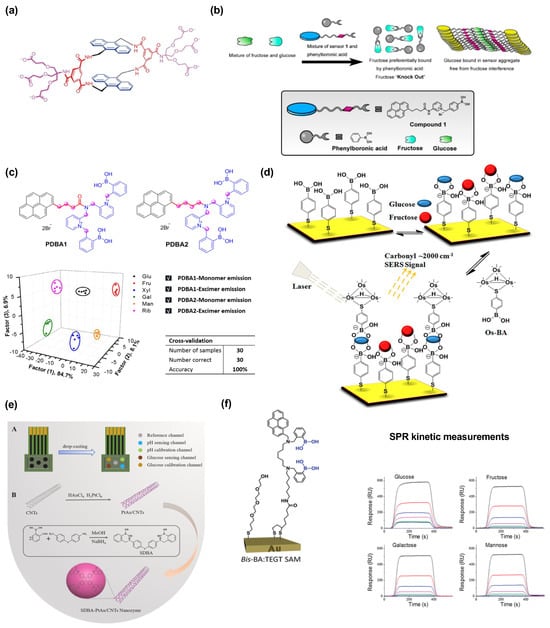 (a) Chemical structure of a synthetic lectin for fluorimetric detection of glucose (adapted from []); (b) pyrene coupled with boronic acid moiety undergoes glucose-assisted AIEE, whereas fructose does not make such aggregates [] (reproduced with permission from the American Chemical Society); (c) a reliable platform for sensing four monosaccharides using two analyst molecules [] (reproduced with permission from the American Chemical Society); (d) on surface glucose detection using boronic acid-conjugated SERS active complex, boronic acid anchors the sugar molecules on the surface and Os-conjugated boronic acid selectively binds to the glucose to produce an SERS signal [] (reproduced with permission from the American Chemical Society); (e) PtAu/CNT composite for potentiometric detection of glucose in body fluid, sensitive device to M concentration [], A and B within the figure shows the device and mode of action for glucose detection (reproduced with permission from Elsevier); (f) Self-assembled monolayer on a gold surface for detection of saccharides concentrations, the colored curves showing concentration-dependent response for different saccharides as a response vs. time plot from surface plasmon resonance kinetics (adapted from []).