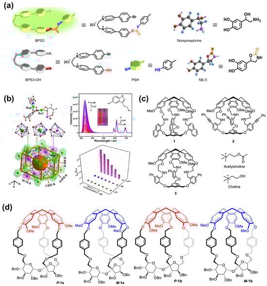 (a) Pyridiniums containing two responsive photons, namely, the fluorescent probe BPS3 and its converted product (BPS3-OH), after carbonyl transfer to norepinephrine to form NE-5 (adapted from []). (b) Chemical structure of NKU-67-Eu, showing the luminescence intensities of NKU-67-Eu with the addition of 5-HT at 332 and 616 nm (top right) and the neurotransmitter selectivity of NKU-67-Eu (bottom right) [] (reproduced with permission from the American Chemical Society). (c,d) Compounds 1, 2, 3, P-1a, M-1a, P-1b, and M-1b are hemicryptophane hosts for sensing choline and acetylcholine [,] (reproduced with permission from the American Chemical Society).