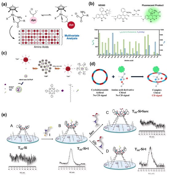 (a) Rh-complex for detection of amino acids using dye replacement multivalent analysis [] (reproduced with permission from the American Chemical Society). (b) Boronic ester-containing dye (NS560) can form covalent bonds with both the –NH2 and –COOH ends of amino acids (adapted from []). (c) Mechanism of “on–off–on” fluorescent assay with the assembly of CdTe quantum dots and zinc 5, 10, 15, 20-tetra(4-pyridyl)-21H-23H-porphine (nano ZnTPyP) [] (reproduced with permission from Elsevier). (d) Representative scheme of complexation between a chiroptic host and chiral amino acid guest (adapted from []). (e) Cavitand molecule supported on Si surface to produce a platform for recognizing the cancer-related amino acid derivative sarcosine, A and B are pristine Tiiii–Si wafer in absence and presence of 1, C and D are in presence of sarcosine and in presence of glycine respectively, the corresponding XPS spectra are given with the diagrams (adapted from []).