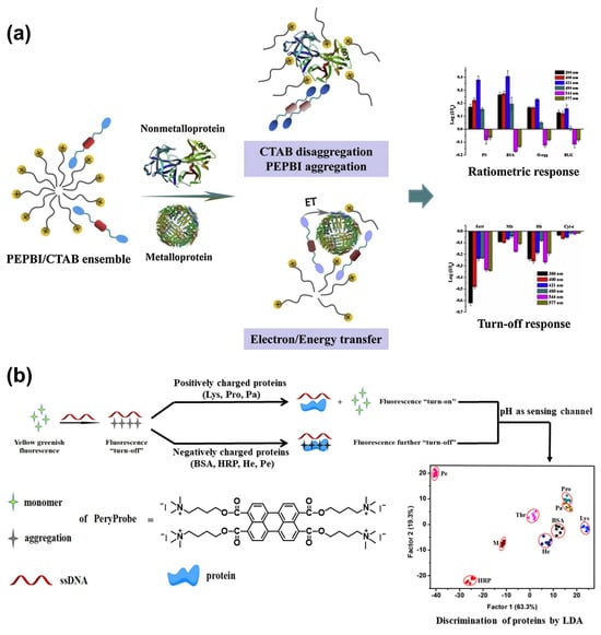 (a) Schematic representation of multiple protein sensing using the PEPBI/CTAB ensemble system [] (reproduced with permission from Elsevier). (b) Discriminating different proteins using a DNA-induced perylene self-assembled structure [] (reproduced with permission from Elsevier).
