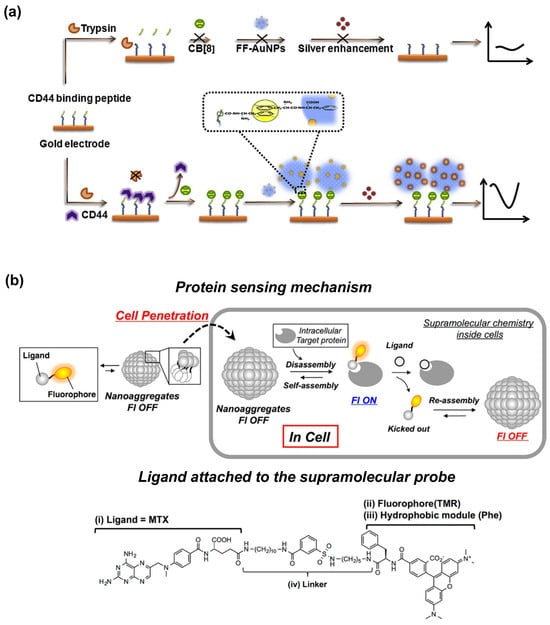(a) Electrochemical sensing of CD44, a biomarker of cancer stem cells, using self-assembled supramolecular nanocomposites [] (reproduced with permission from Elsevier). (b) Protein sensing using ligand-mediated recognition followed by self–assembly–induced fluorescence change [] (reproduced with permission from the American Chemical Society).