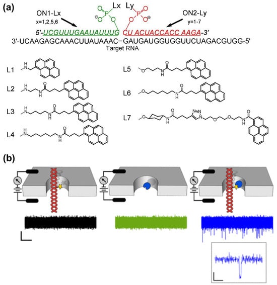 (a) Pyrene attached dual probe platform for excimer–forming sensor assay [] (reproduced with permission from Elsevier). (b) Diagrammatic representation of solid-state nanopores to detect target DNA [] (reproduced with permission from the American Chemical Society).