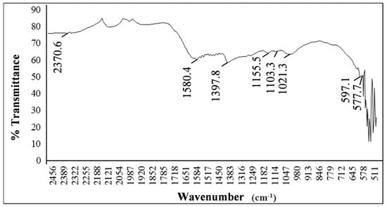 The FTIR spectrum of ferrous–ferric oxide nanoparticles showed peaks near 597 cm−1, which was related to the existence of magnetic component (Fe–O) stretch vibrations (Figure 5) [27,28]. It also denotes the purity of the magnetite particle.