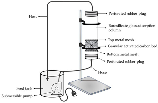 Sugarcane vinasse was treated to remove the organic component, which can be toxic, and/or inhibit the growth of microorganisms [26], which are difficult to biodegrade [27]. An adsorption system was designed based on previous work in our laboratory. Figure 1 shows a schematic of the experimental setup, which consisted of a borosilicate glass batch adsorption column (5 cm internal diameter and 30 cm length). A fixed bed (25 g) of granular activated carbon (GAC) was placed at the bottom of the column and, to sustain the carbon bed, a cylindrical support was constructed with two metal meshes at the top and bottom of the GAC bed.