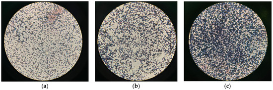Detection of PHB by 100× microscopy using Sudan black staining: (a) 24 h, (b) 48 h, and (c) 72 h.