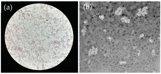 The results of biomass and biopolymer accumulation obtained using vinasse supplementation and dextrose from cassava starch in different proportions are shown in Table 3. In addition, at the end of the production time (48 h), the presence of PHB granules in the cells was confirmed by staining with Sudan Black B and through microscopic observation, as displayed in Figure 4.