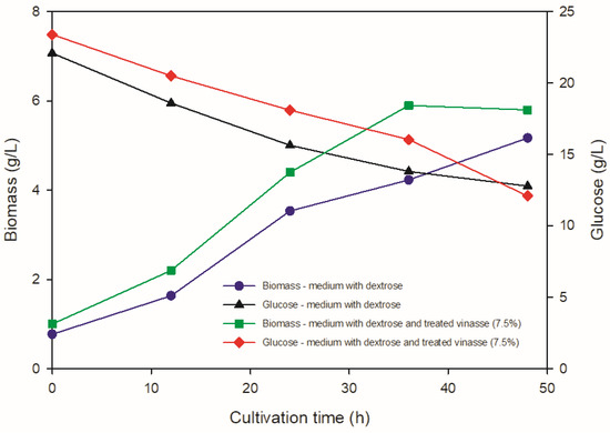 Additionally, when the treated vinasse proportion in the medium is 25% v/v, a considerable decrease in the amount of biomass obtained is seen. Nevertheless, when the proportion increases again between 50 and 75% v/v, biomass production tends to increase again, which can be justified because although the concentration of polyphenols in the medium increases, sugars are more available. Therefore, the increase in vinasse in the medium leads to an increase in compounds that have negative and positive effects that counteract each other.